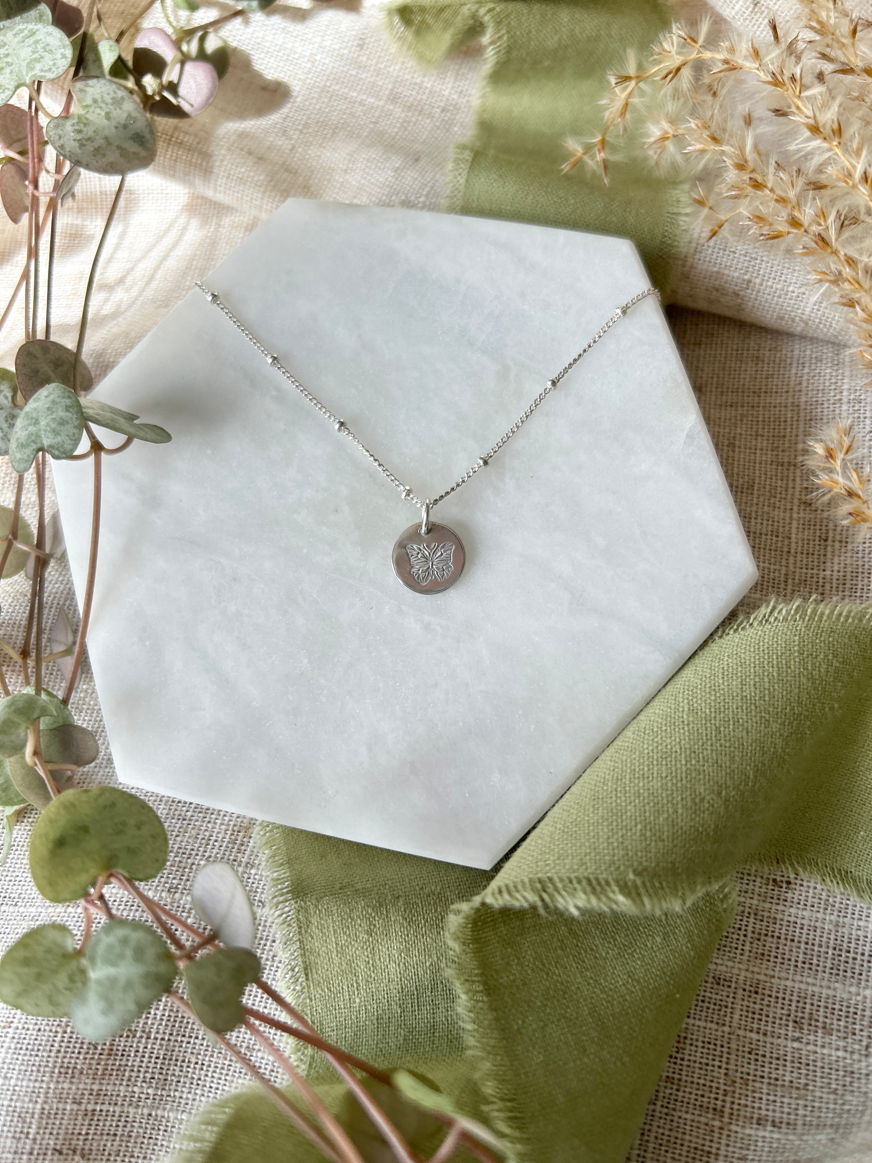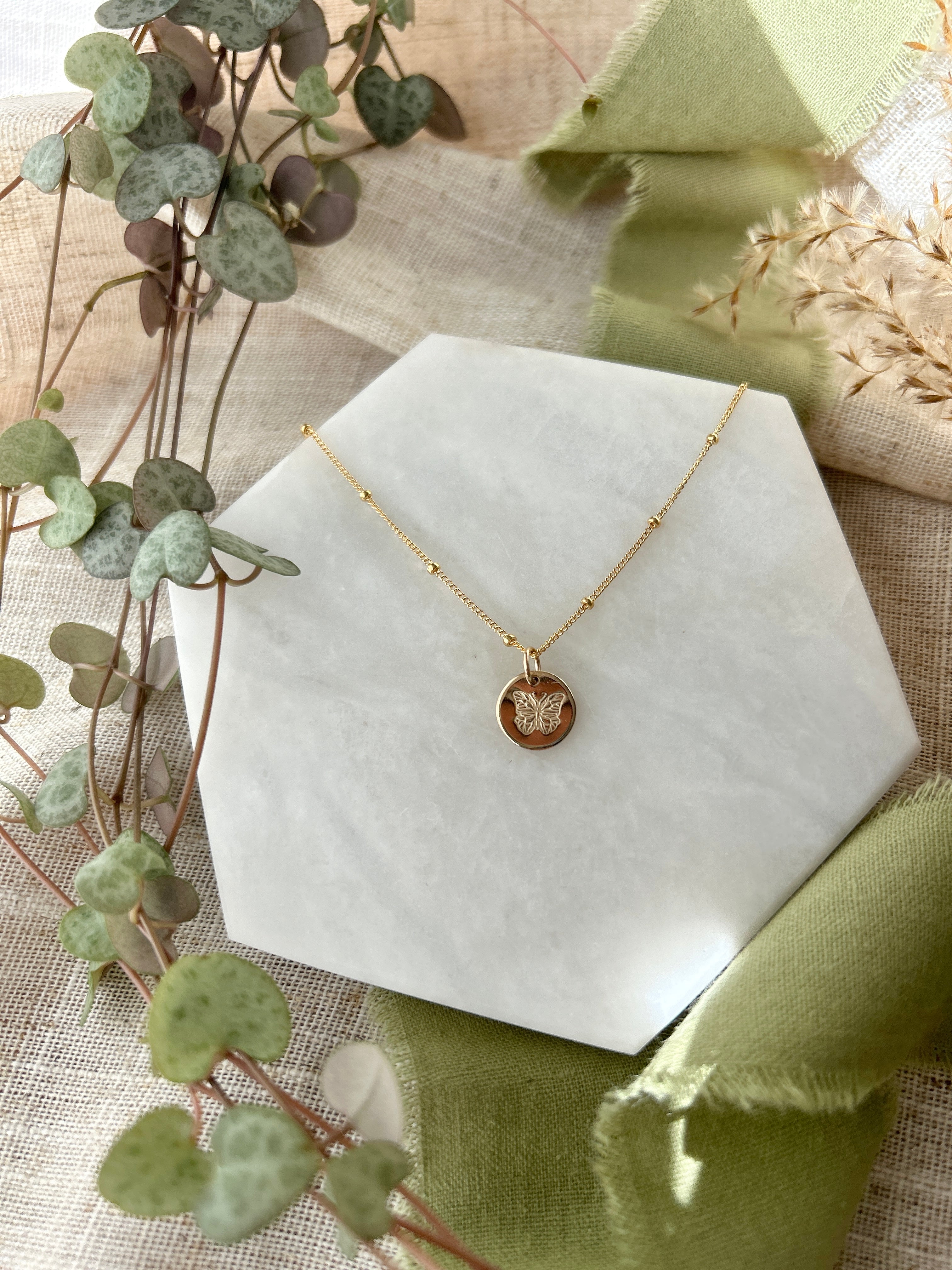 This beautiful butterfly necklace is available in sterling silver, gold-filled or our mix metal necklace which comes on our most popular sterling silver satellite chain and gold filled pendant.