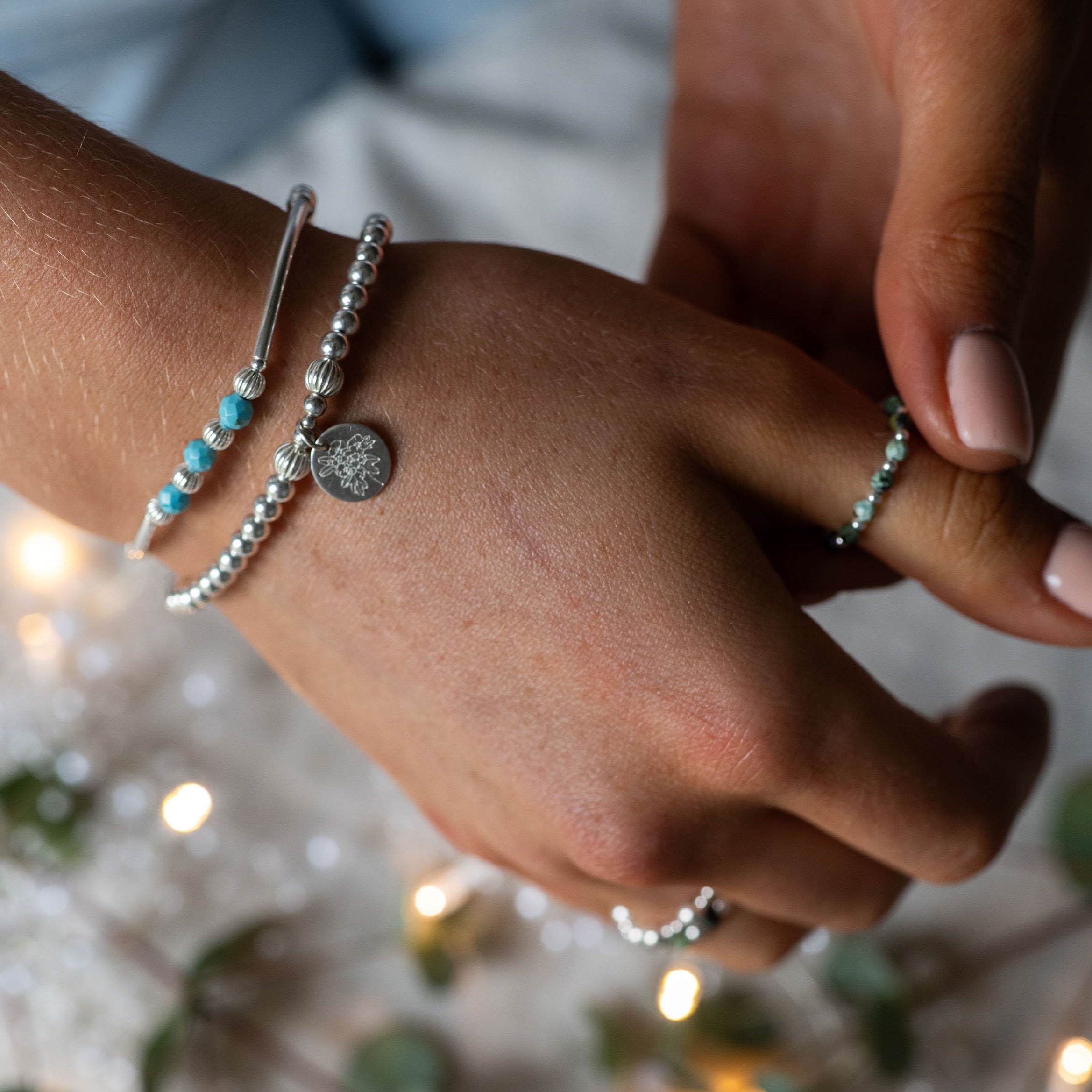 Stay connected to your loved ones with this delicate Beaded Birth Flower Bracelet. Crafted from gold-filled beads and hand-threaded on premium jewellery elastic, it features a hand-stamped birth flower pendant, a gentle reminder of someone special or a moment you want to hold close.