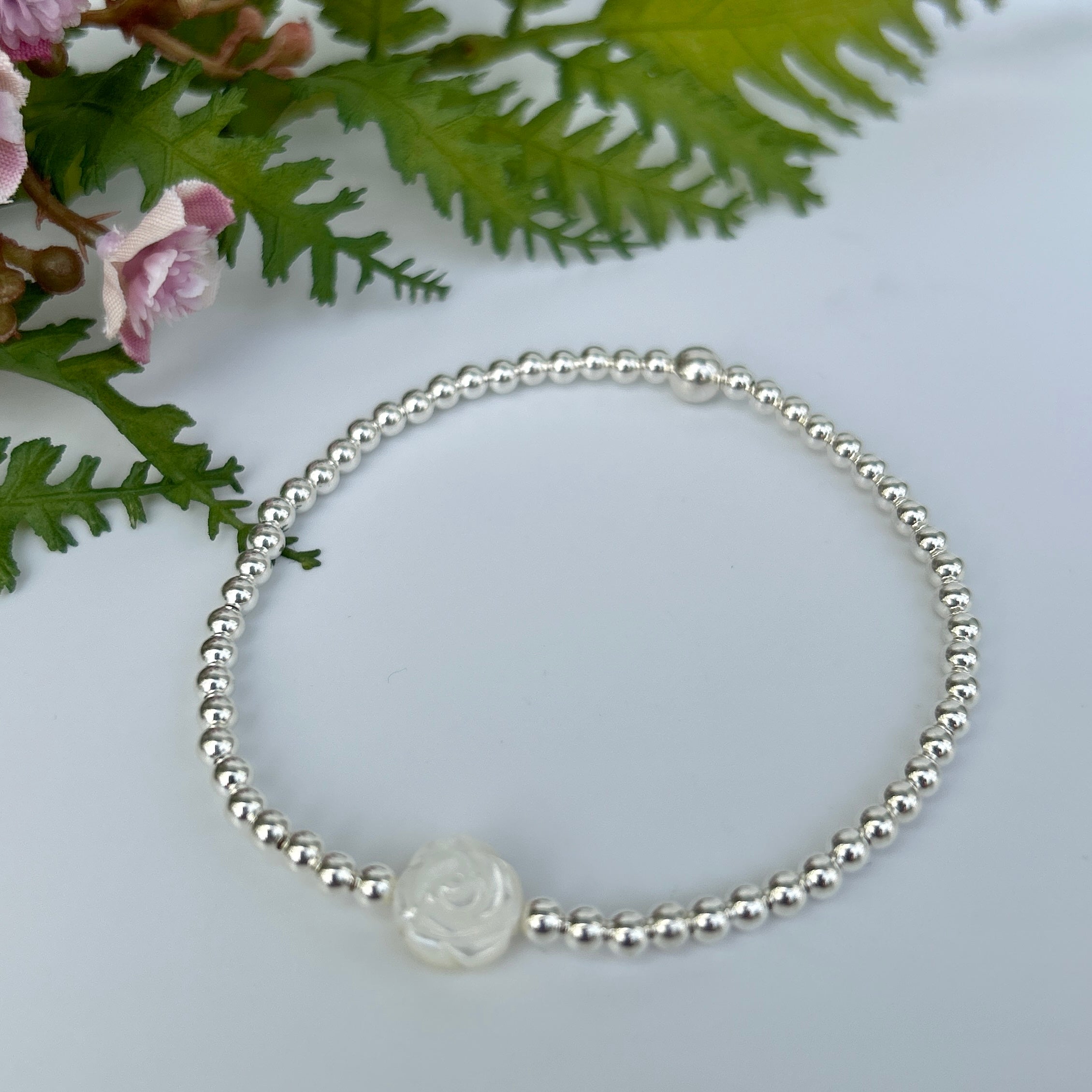 Our Mother Of Pearl Rose bracelet is a beautiful new addition to our stacking collection.