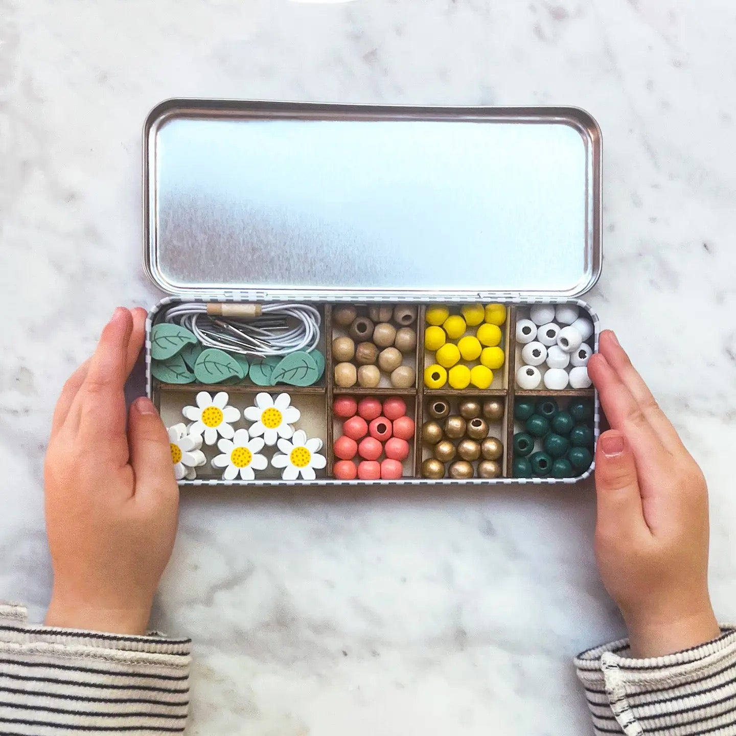 MATERIALS: tin, 10 wooden daisy beads, 8 wooden leaf beads, 60 spherical wooden beads, 5 white elastics with metal ends for easy threading. UKCA/UKNI/CE tested