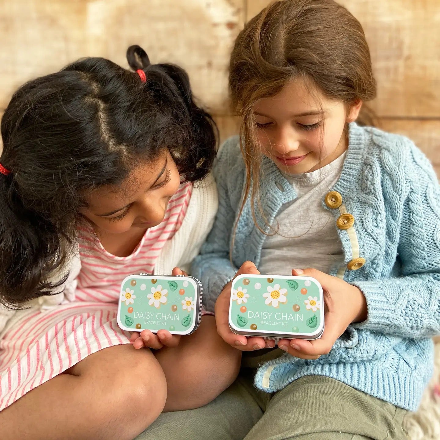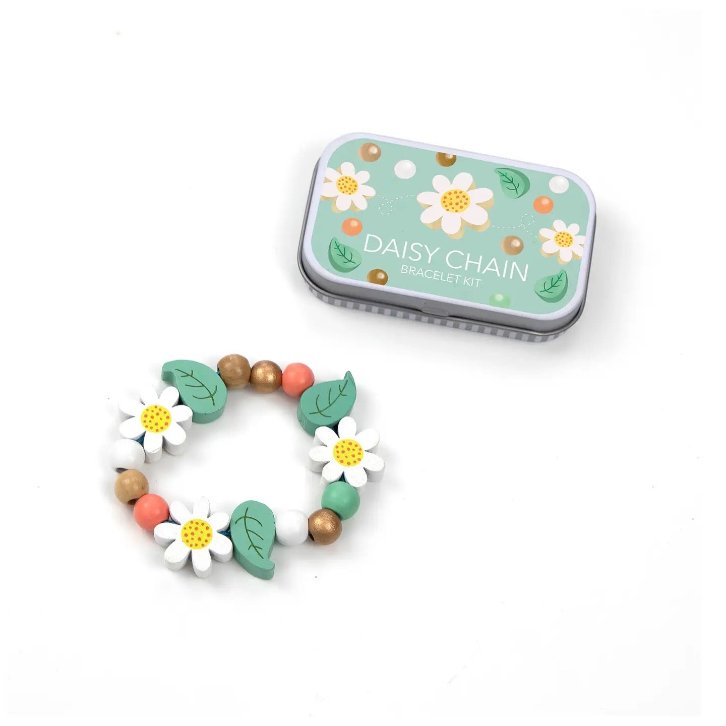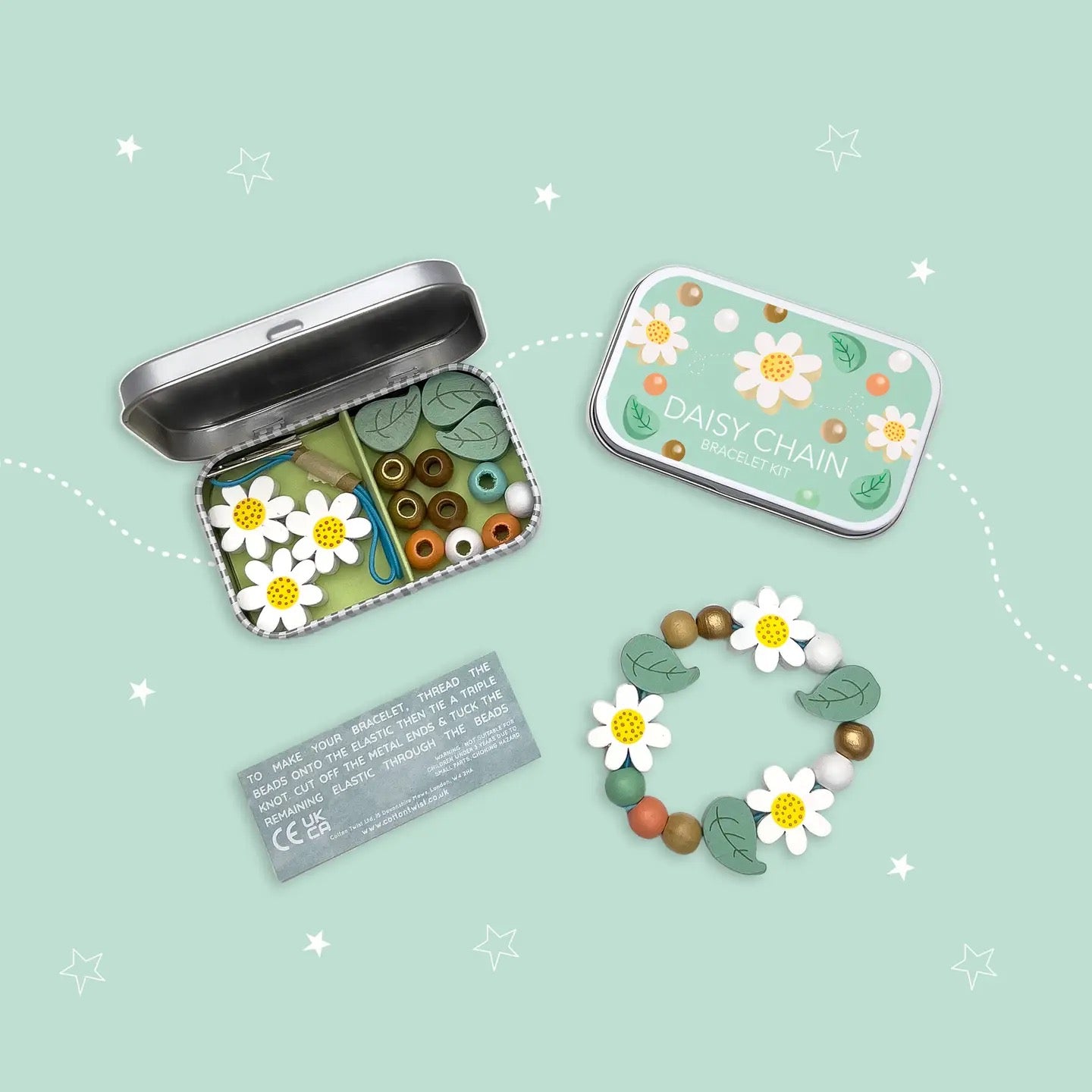 A beautiful gift tin containing elastic & beads to create a beautiful wooden daisy chain bracelet. The elastic comes with metal ends to aid the beading process for young children. Then patience & precision are all that's required to assemble this piece.