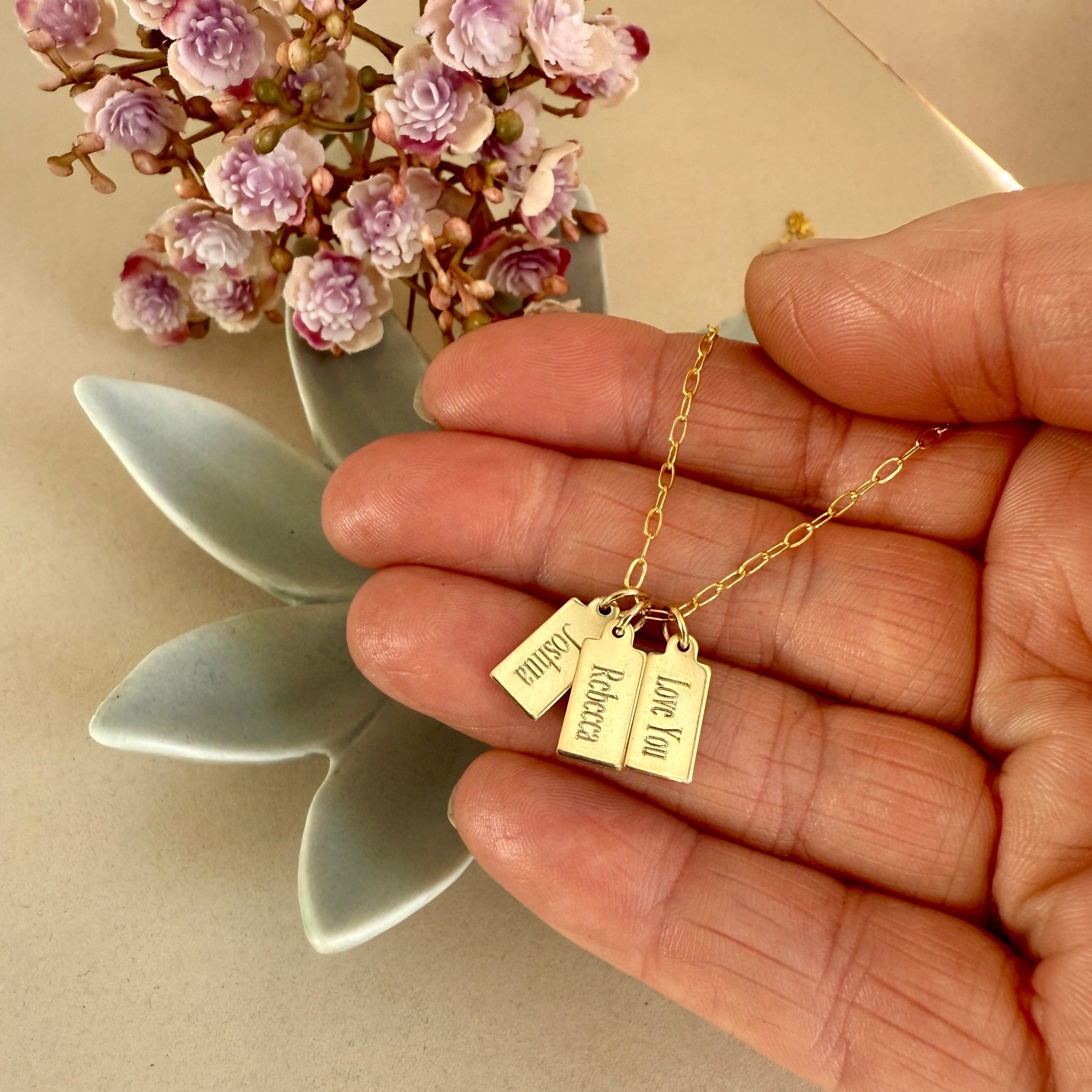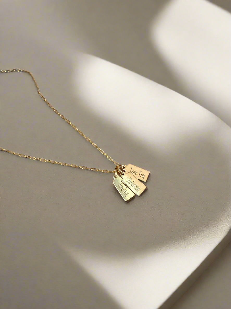 Our engraved name tags are a timeless, sentimental piece designed to carry the names that matter most. Whether it’s a loved one, a special date, initial or a meaningful word, each tag is delicately engraved and hangs from a beautifully detailed gold-filled or sterling silver chain.