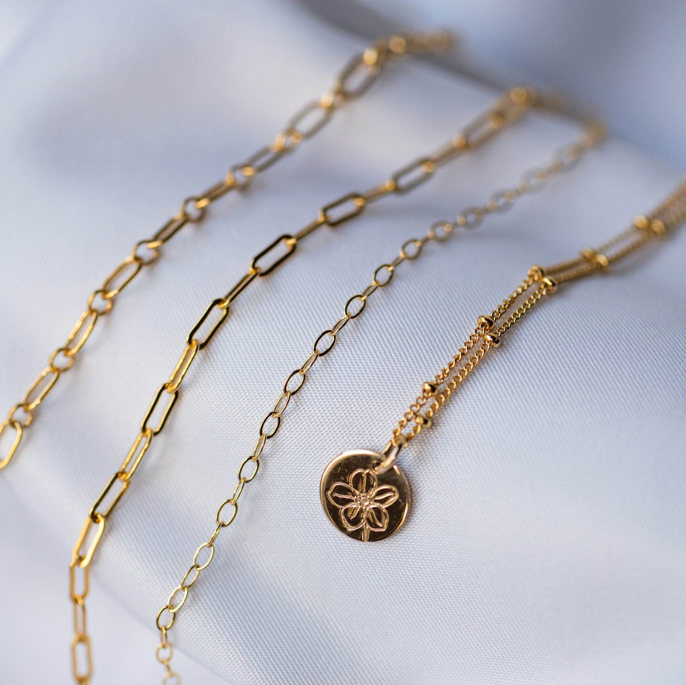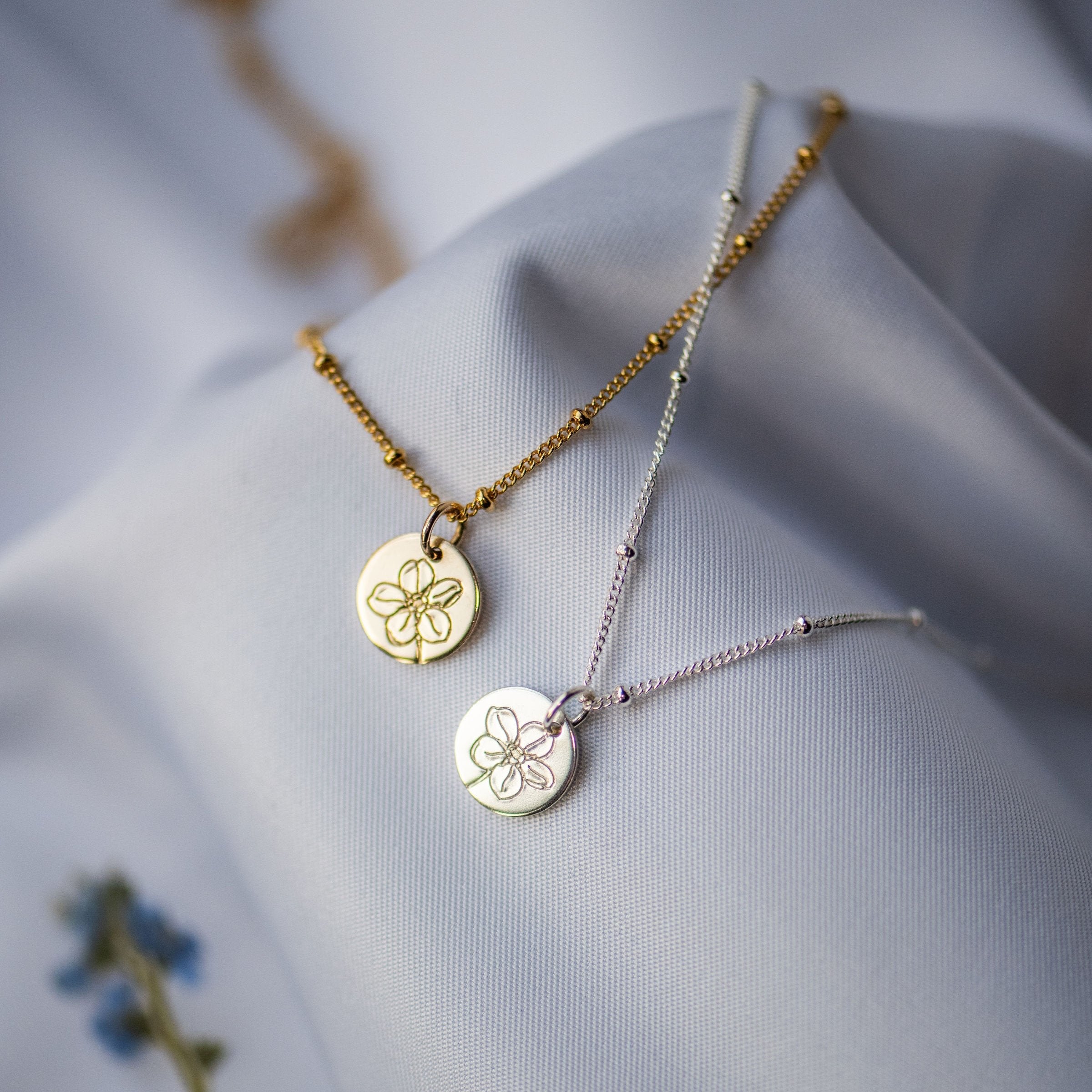 Hand stamped with the forget-me-not, this piece is available in four different chain styles - Becky, Haven, Knotted and Cable, in both sterling silver and gold filled. Each chain brings its own unique touch, so you can choose the one that suits your style.