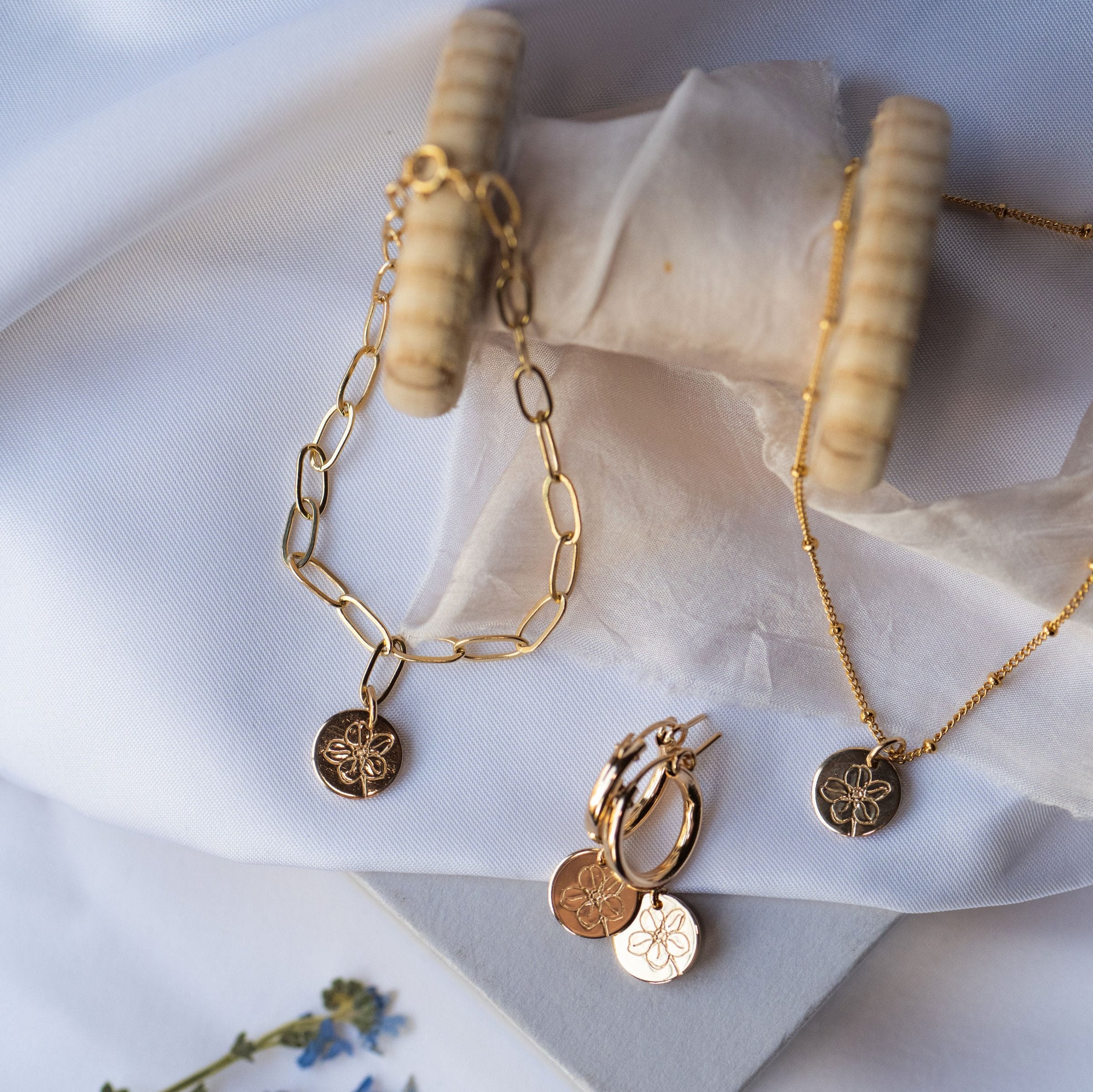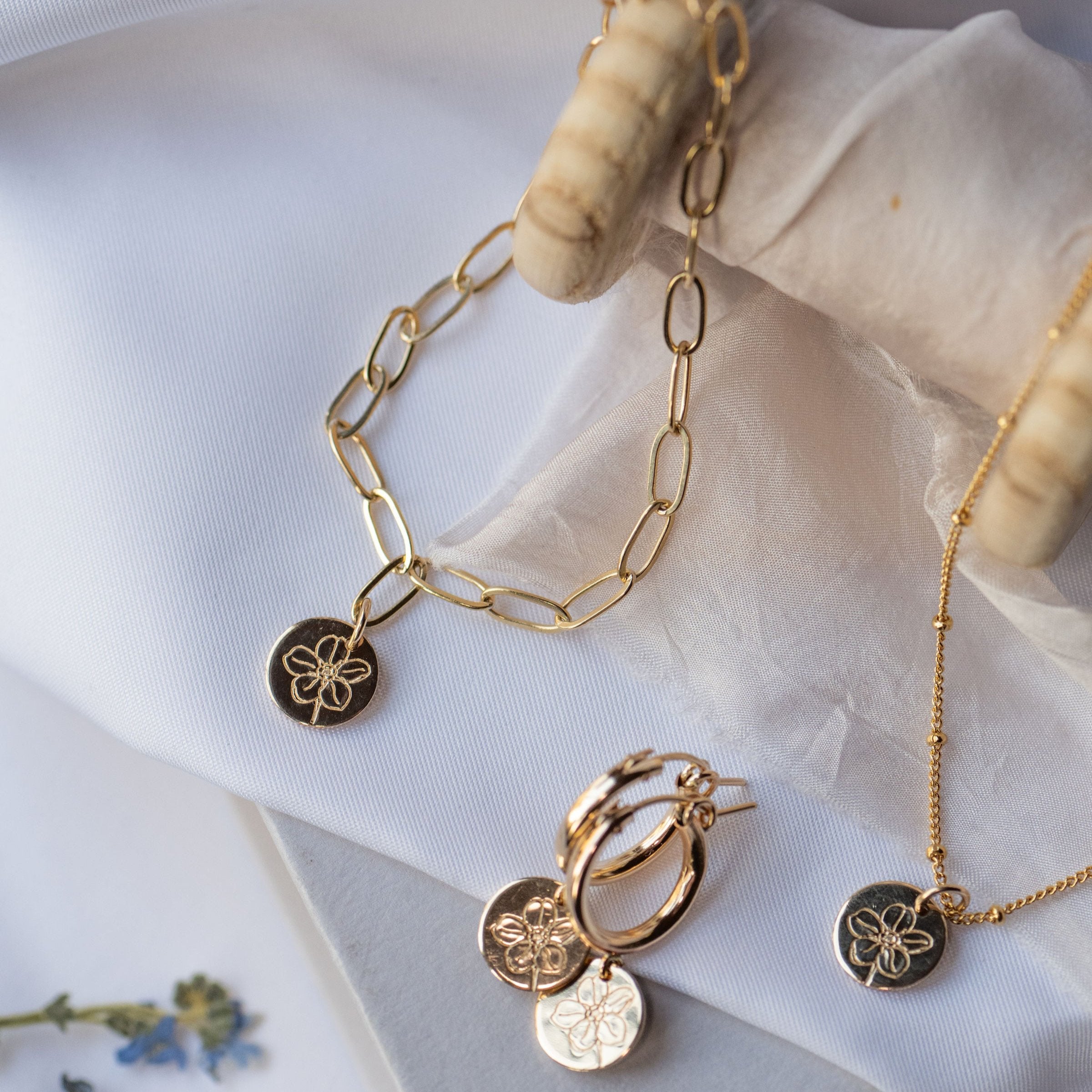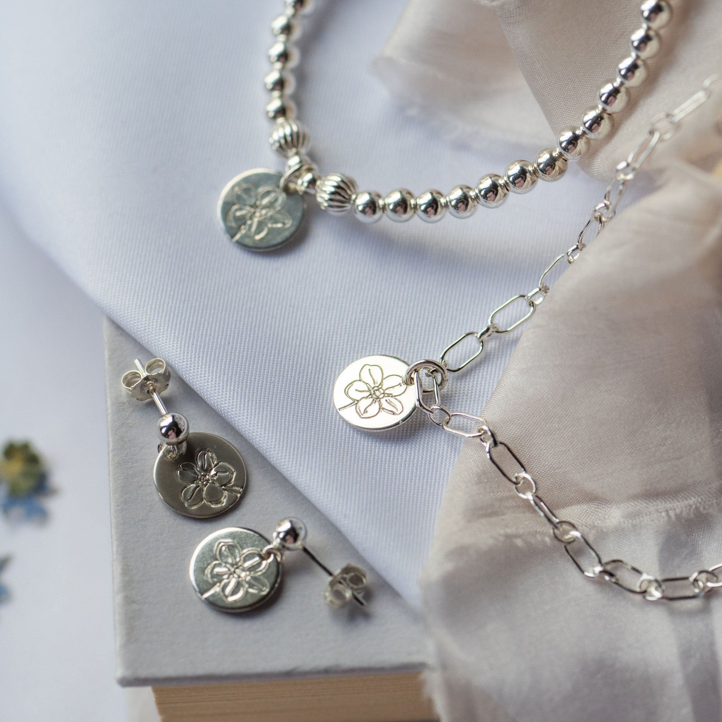 A beautiful paper link chain and finished with a forget-me-not pendant, available in both gold filled and sterling silver. This bracelet is easy to wear on its own or with your other Rebecca May favourites, and a beautiful way to keep a loved one's memory with you each day. Bracelet measures 7 inch, for a custom size please send us an email.