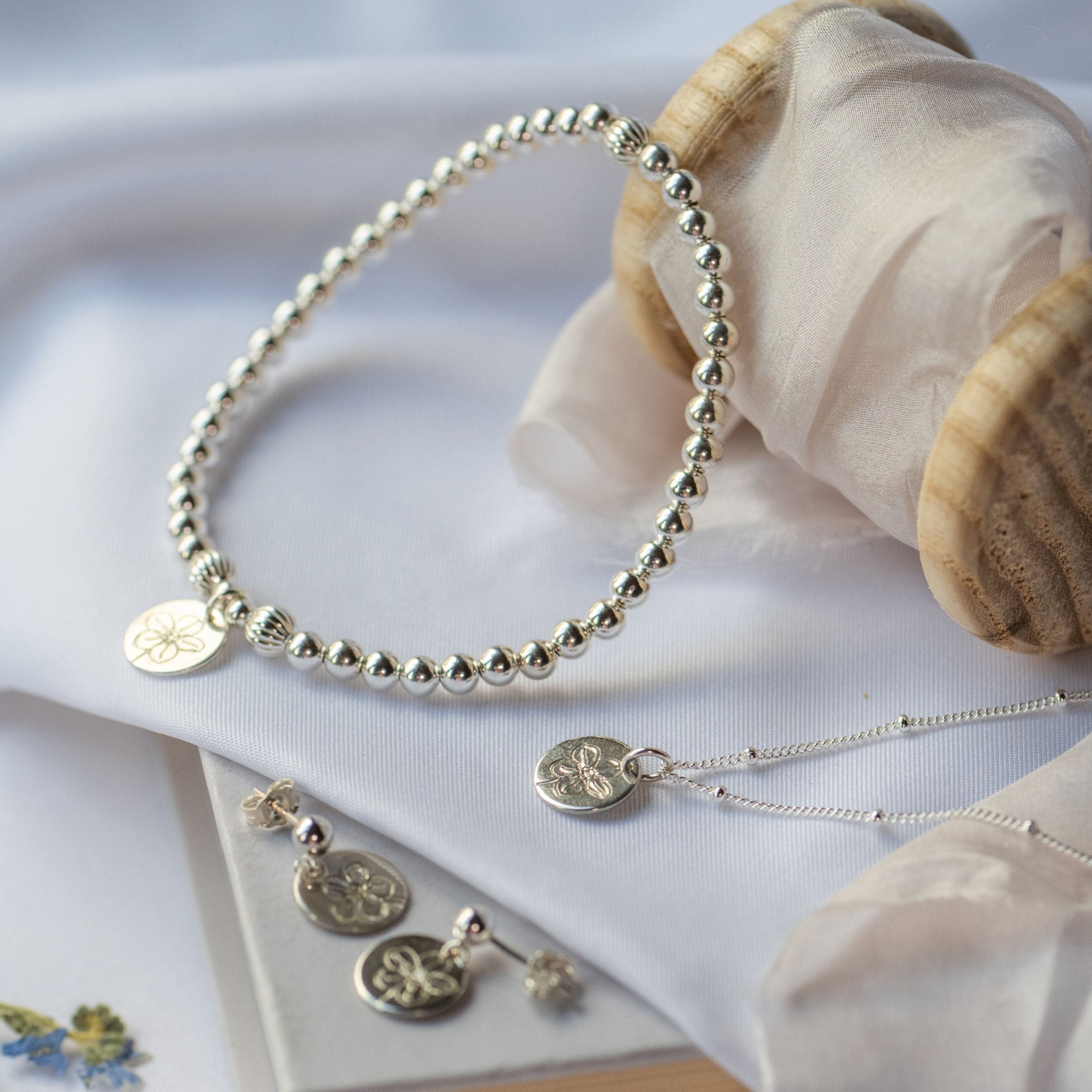 Hand stamped with the forget me not flower, they are available in three different styles - Huggie, Drop and Ball Stud and come in either gold filled or sterling silver. Each pair is designed to be an easy, everyday piece with a meaningful sentiment, making them a thoughtful gift or a personal keepsake and a way to hold loved ones close.