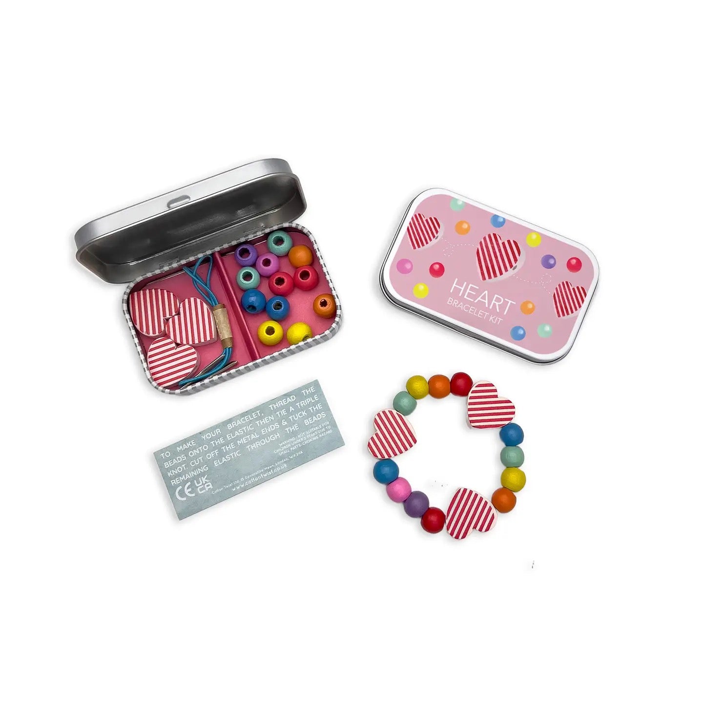 Hinged tin, wooden heart beads, spherical beads, elastic with metal ends to aid beading. UKCA/UKNI/CE tested