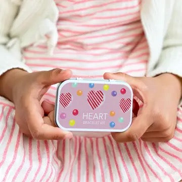 A beautiful personalised gift tin containing elastic & beads to create a heart bracelet fit for a princess. The elastic comes with hard ends to aid the beading process for young children. Then, patience & precision are all that's required to assemble this piece.