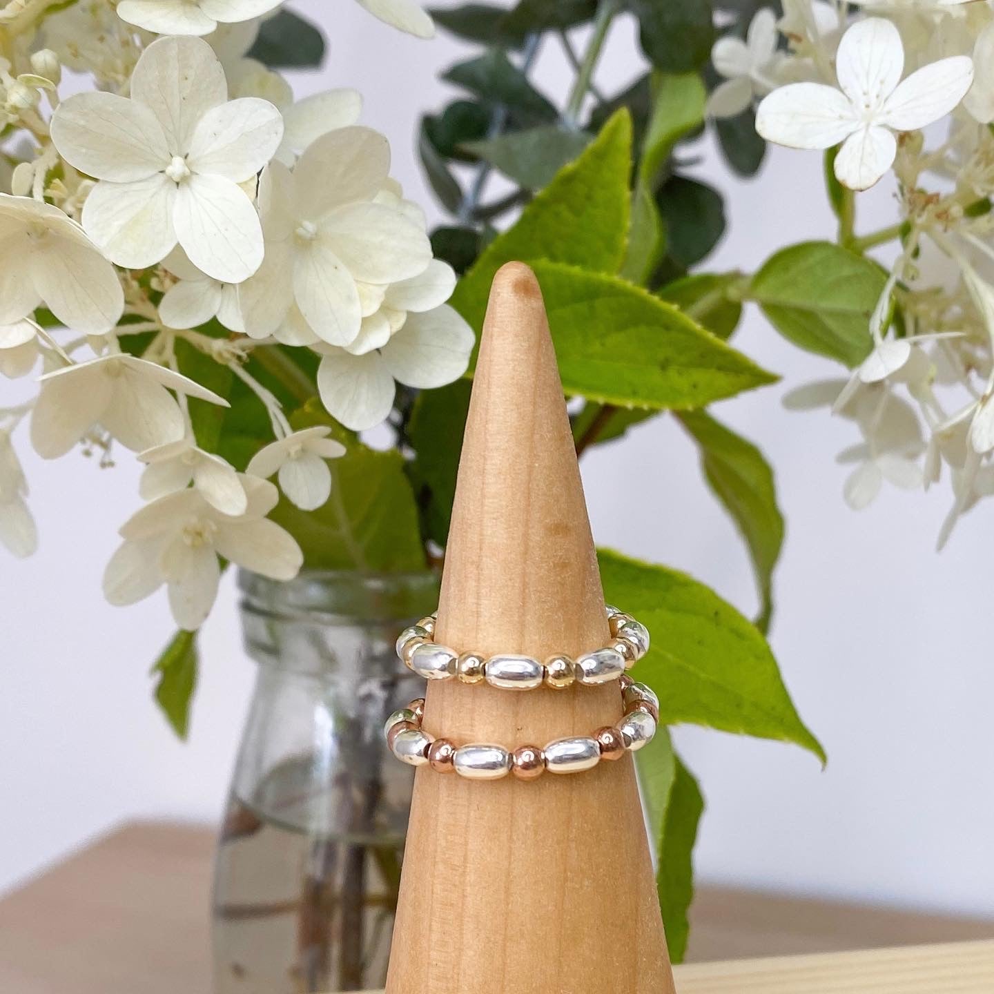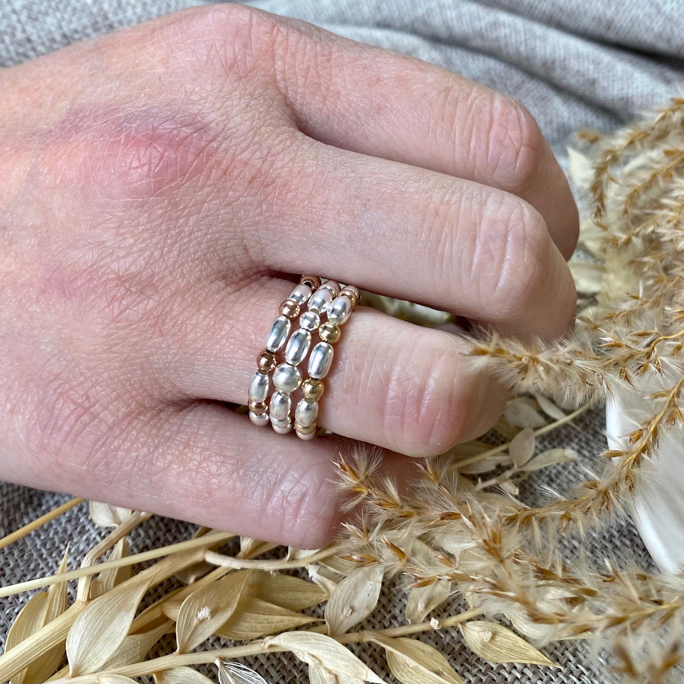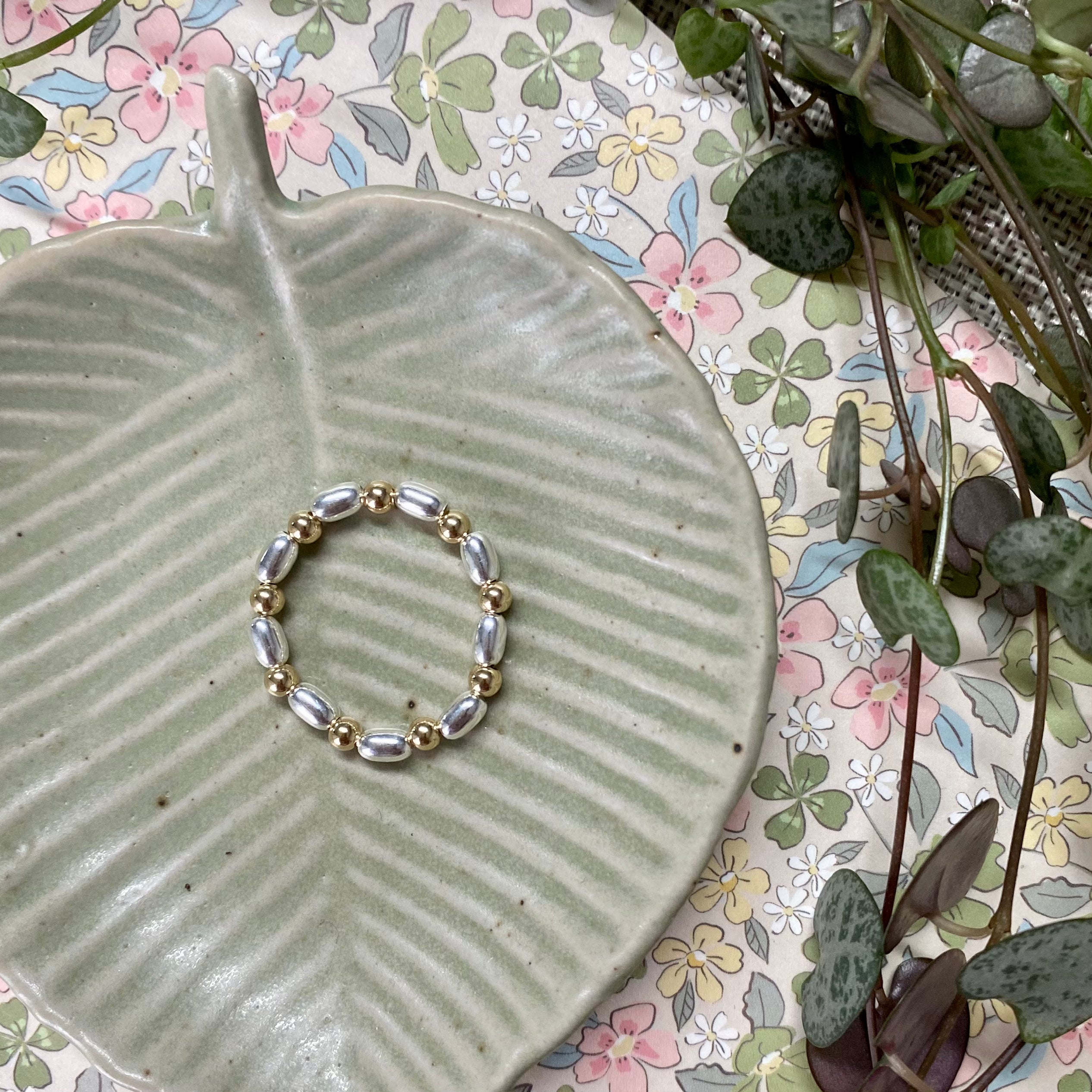 Made with a mix of oval sterling silver and gold filled beads and stacks beautifully with our other Rebecca May rings.