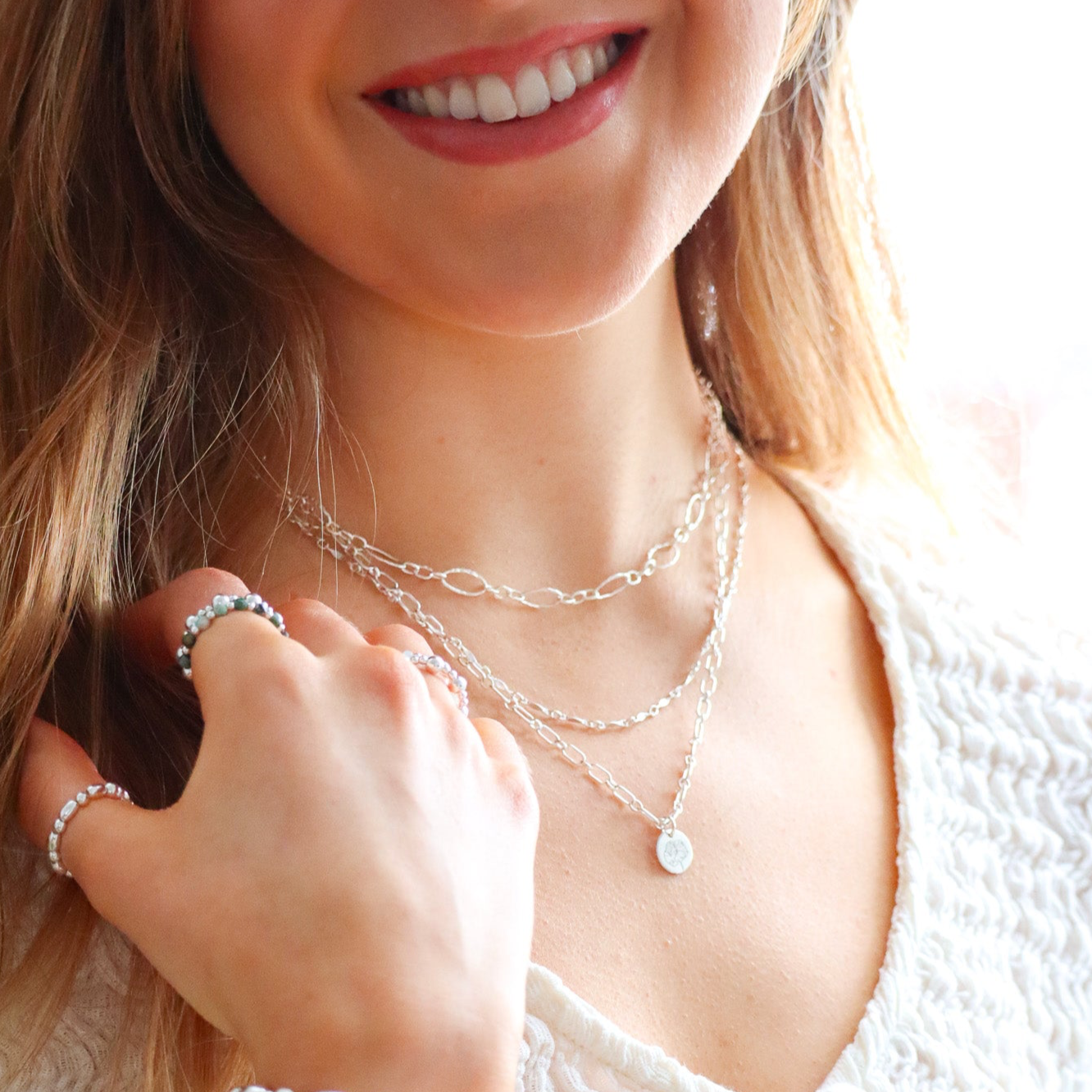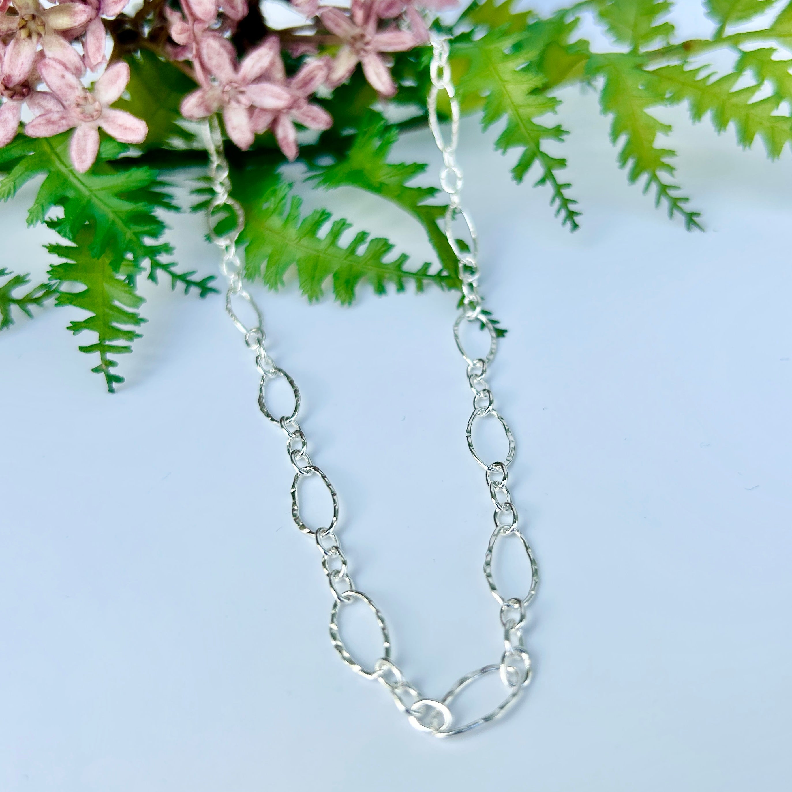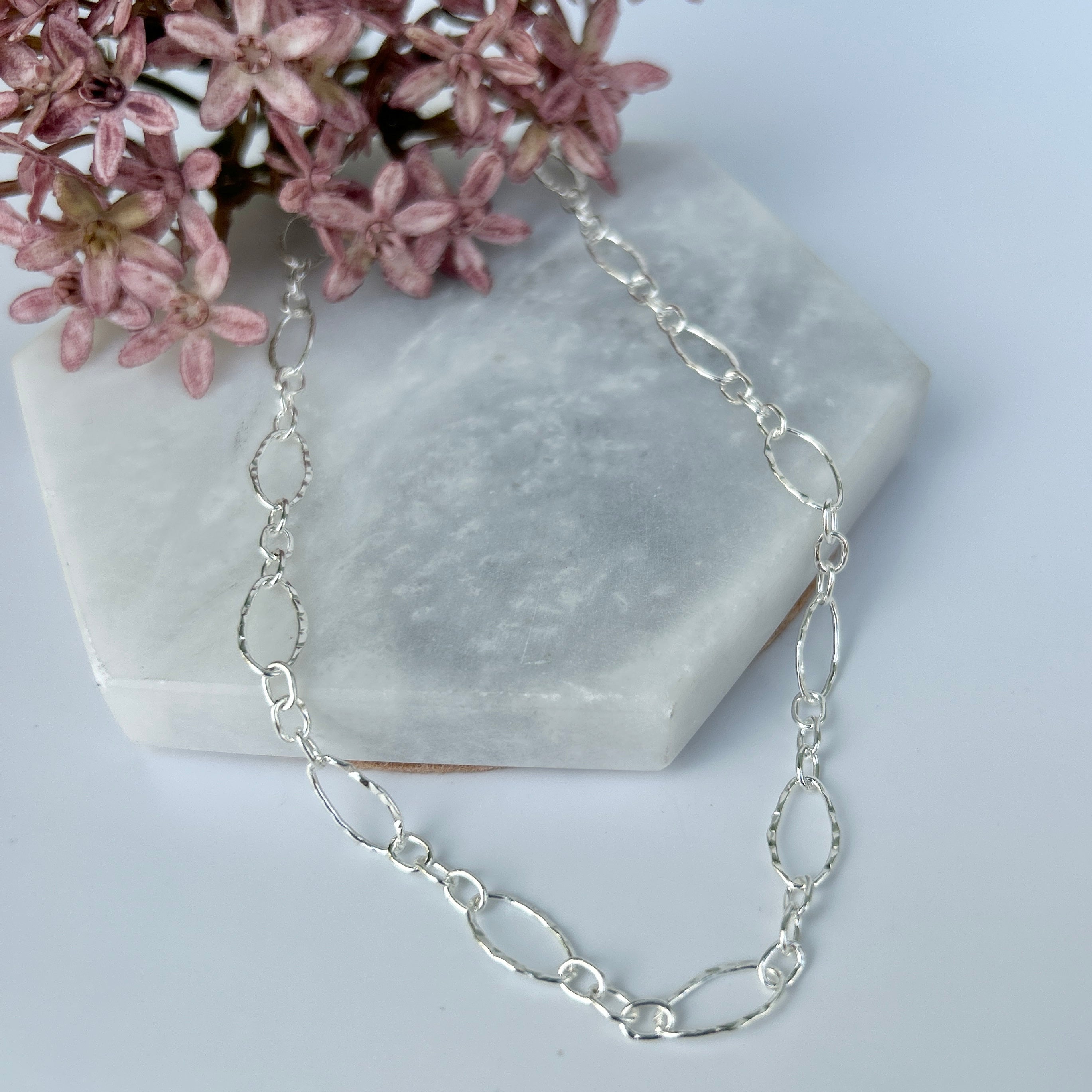The Olivia necklace is made from high-quality 925 Sterling silver, and features a stunning textured hammered finish and a beautiful large link chain. Whether worn on its own or layered with our delicate birth flower chains, it adds a touch of elegance to any outfit.
