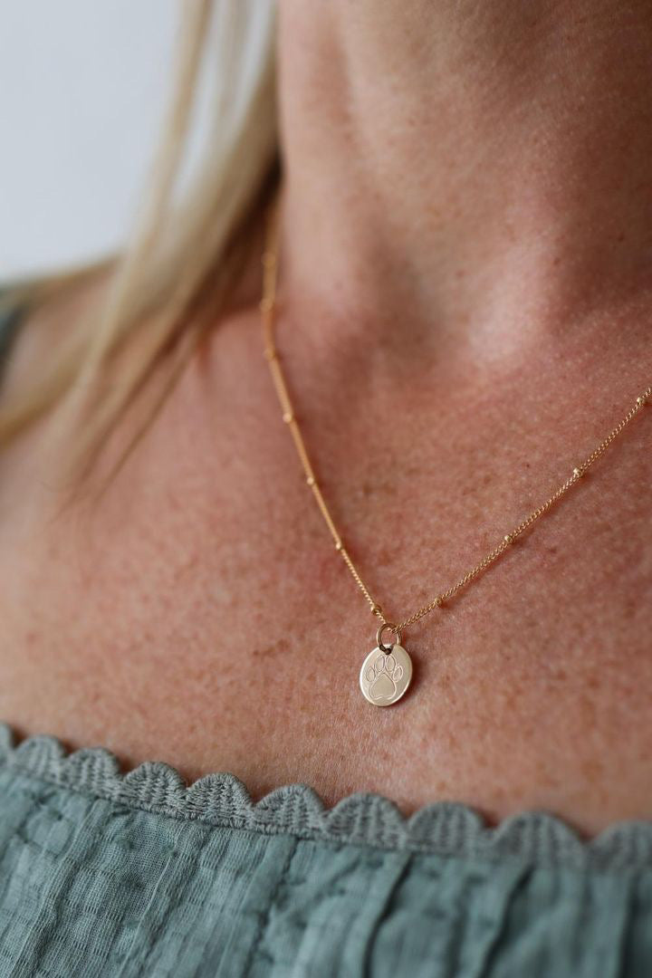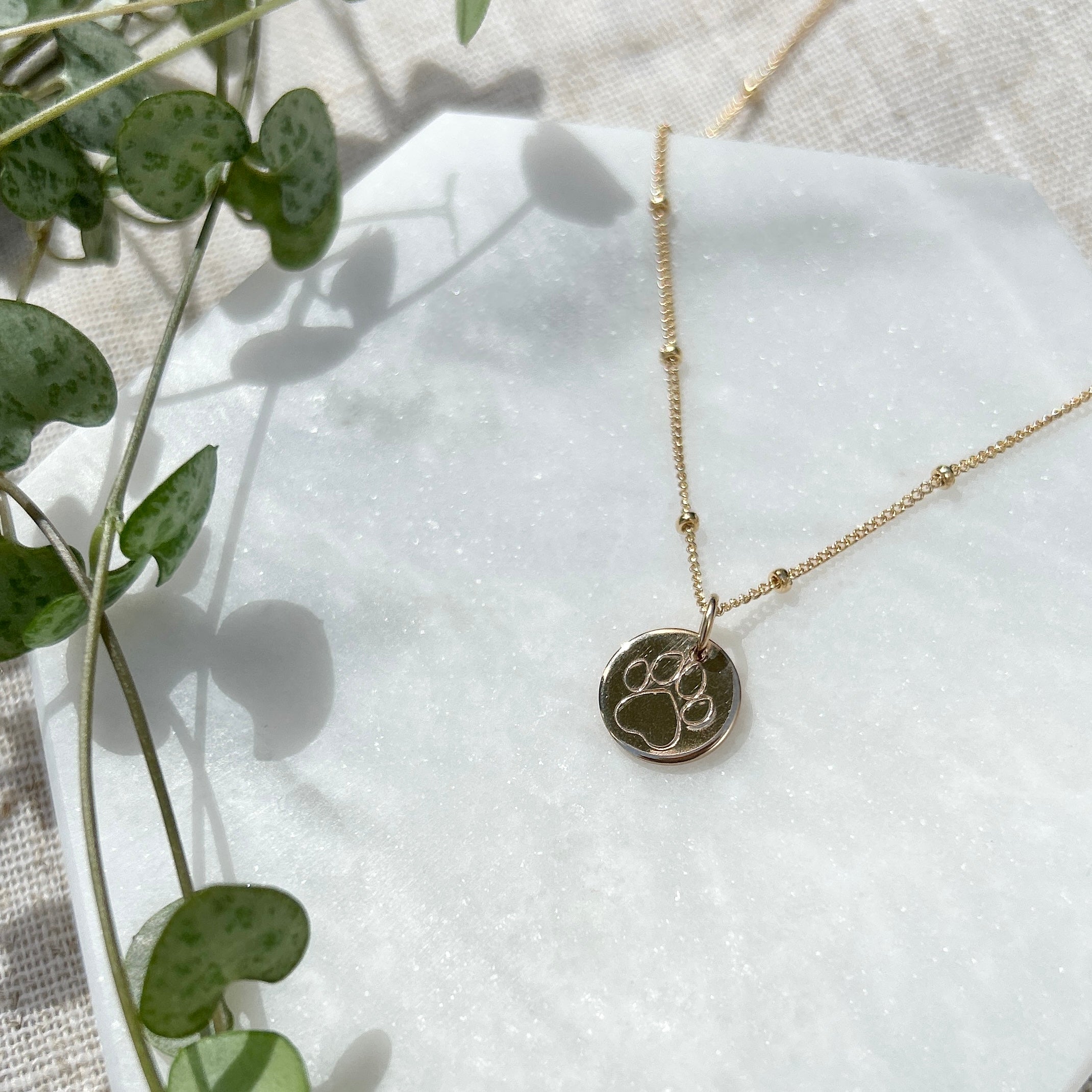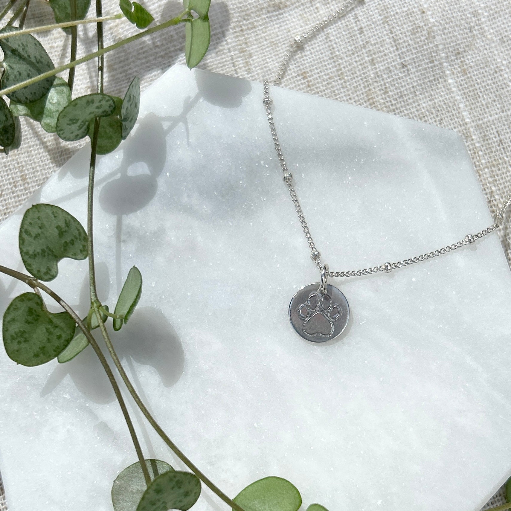 The beautiful pawprint charm is handstamped onto our sterling silver or gold filled pendents so you can carry your beloved pet close to your heart.