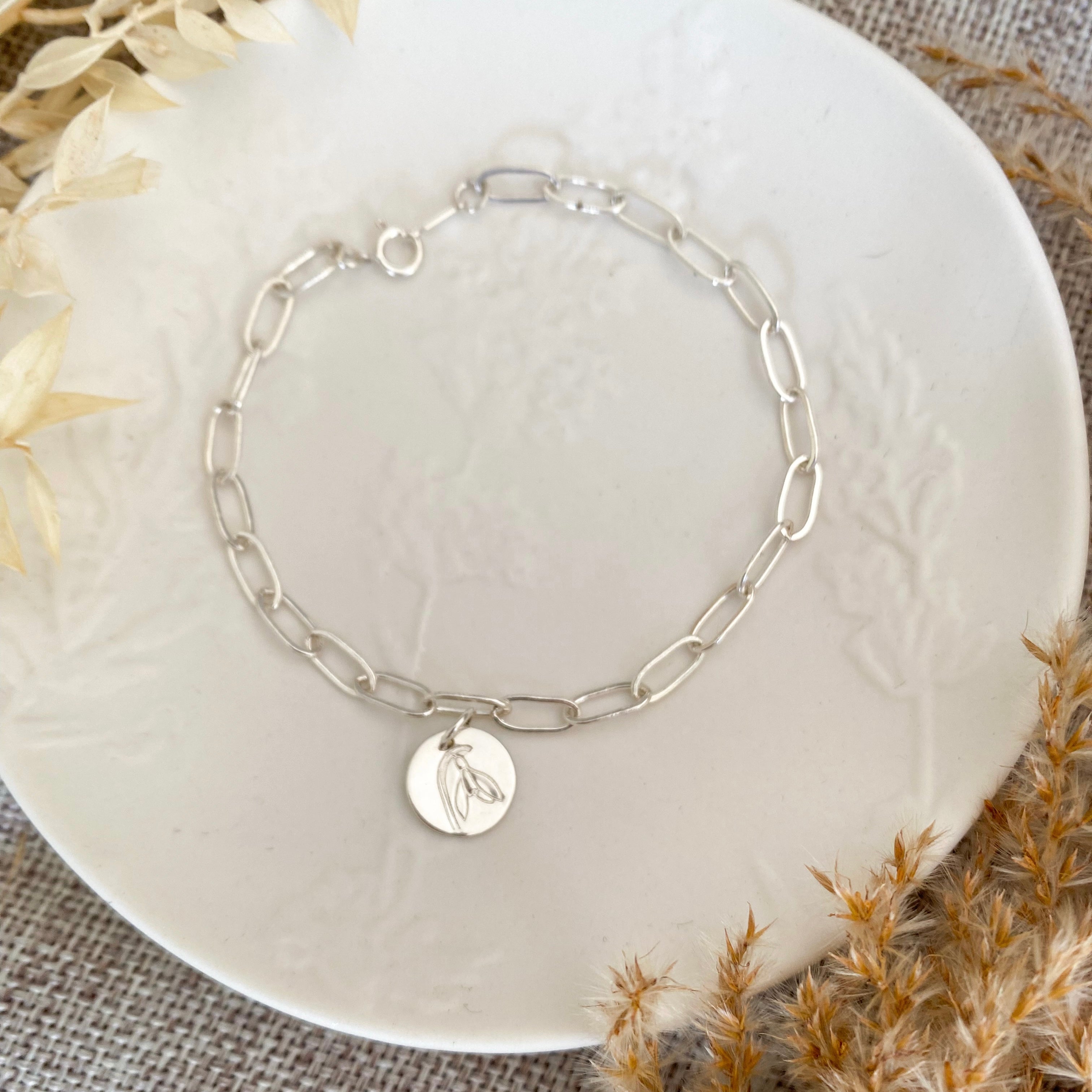 Inspired by the beauty of flowers, the Haven Birth Flower Bracelet is a timeless piece designed to carry meaning close to your heart. Featuring a hand-stamped birth flower pendant on a delicate 18.5cm paperclip chain, this bracelet is a symbol of love, connection, and cherished memories.