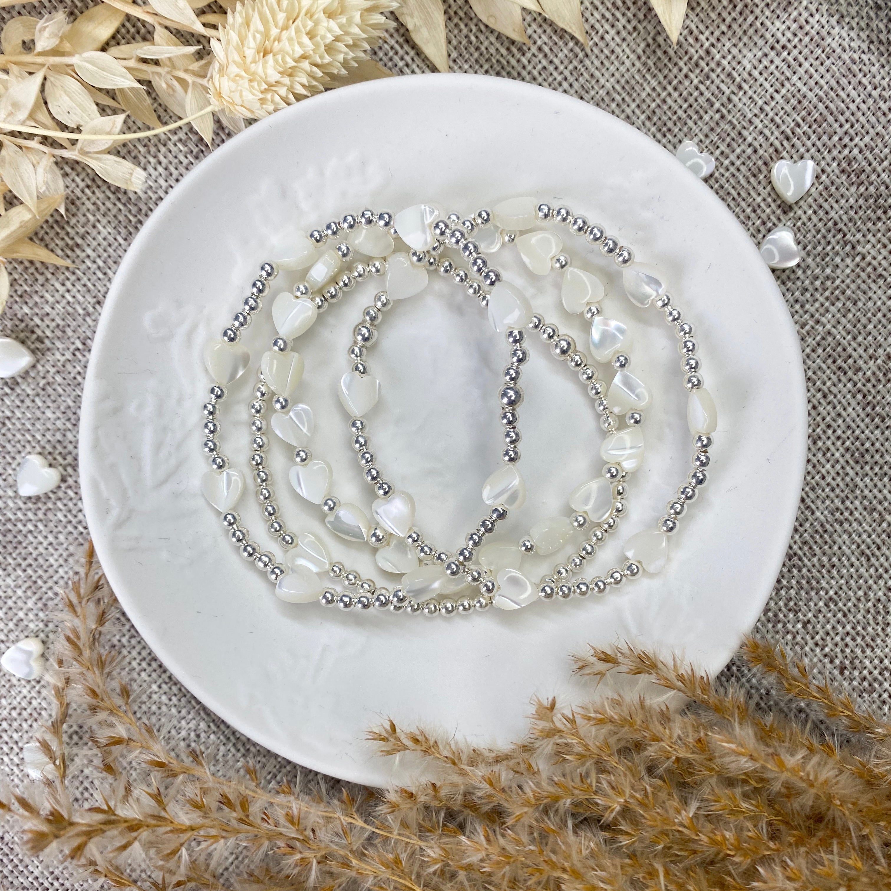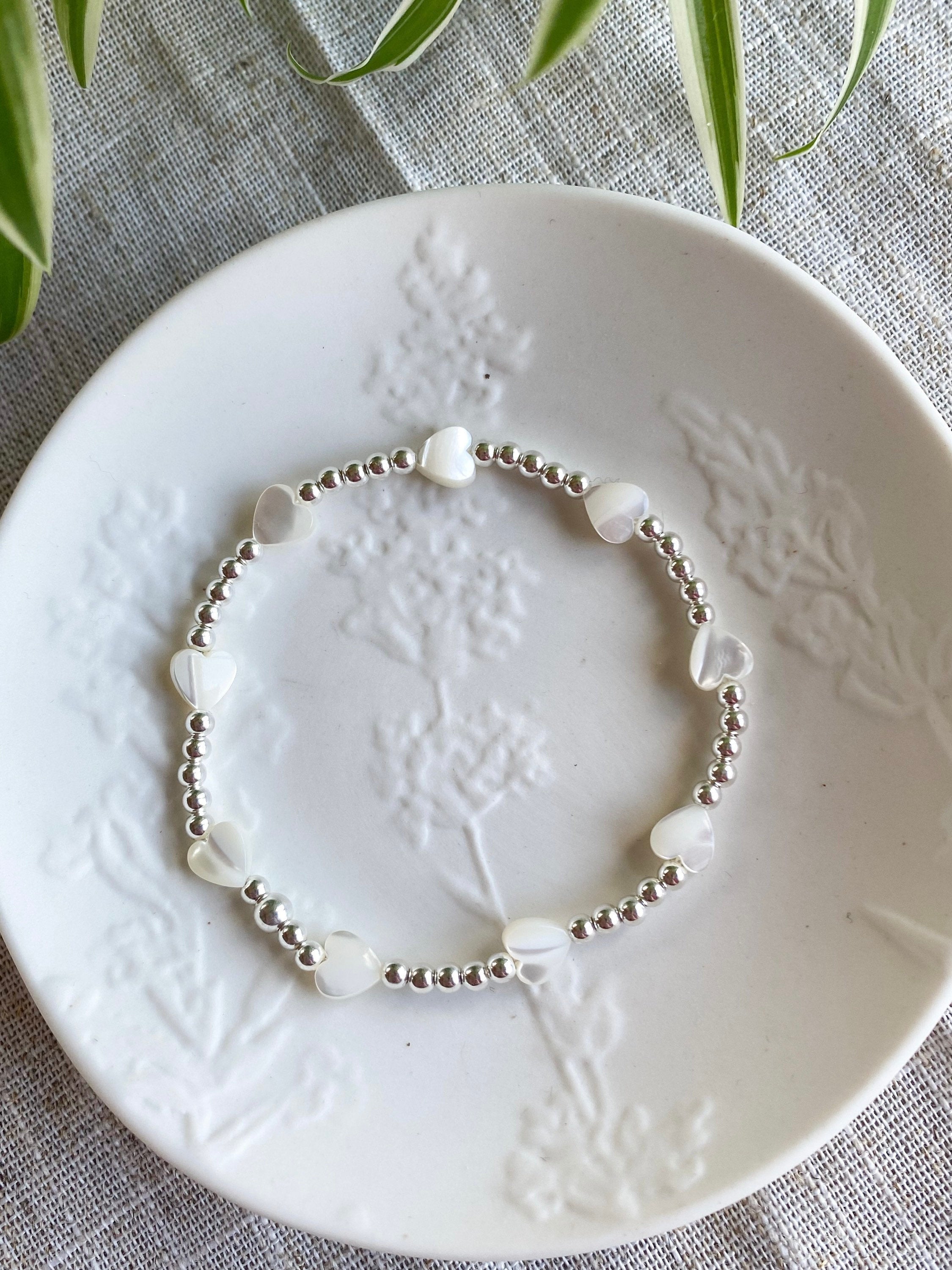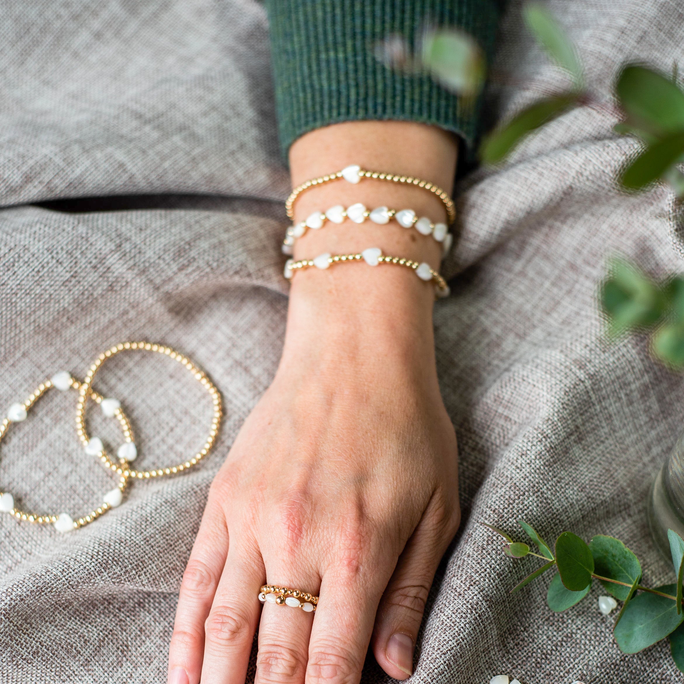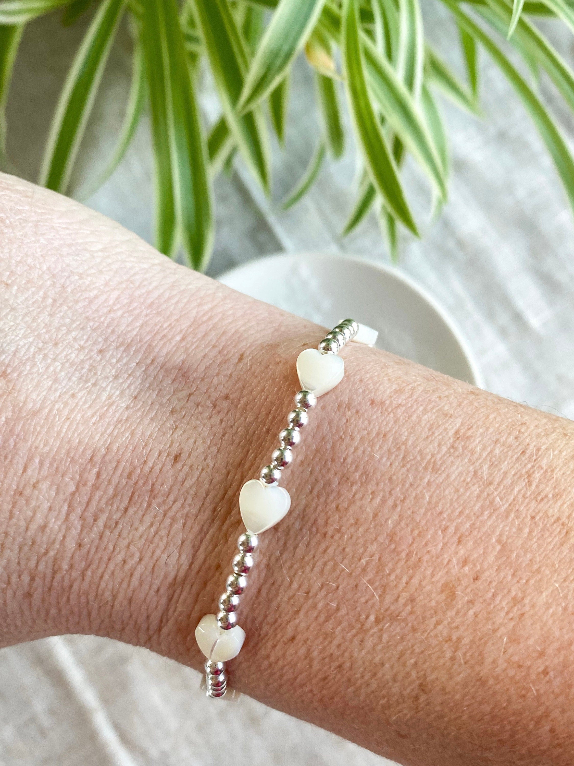 Made of natural white mother of pearl shell, the heart's surface is not flat, but raised and smooth, and comes in your choice of rose gold filled, yellow gold filled or sterling silver beads. Perfect for wearing alone or added to a stack. What is not to love about this gorgeous String Of Hearts Bracelet.
